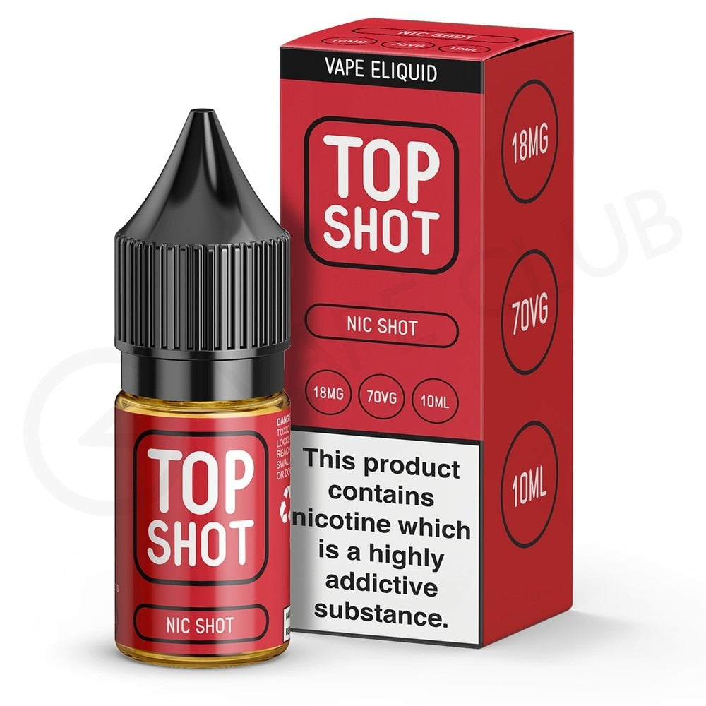 The 70VG Nicotine Shot by Top Shot is available in a 10ml bottle with 18mg nicotine strength, when added to a 50ml shortfill you will create 60ml of 3mg e-liquid. Alternatively, if you add two shots to 100ml of 0mg e-liquid you'll create 120ml of 3mg e-liquid.